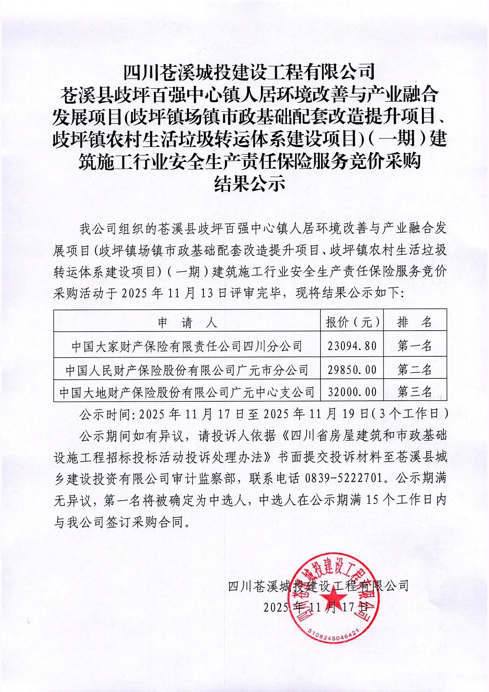 四川苍溪城投建设工程有限公司苍溪县歧坪百强中心镇人居环境改善与产业融合发展项目(歧坪镇场镇市政基础配套改造提升项目、歧坪镇农村生活垃圾转运体系建设项目)(一期)建筑施工行业安全生产责任保险服务竞价采购结果公示