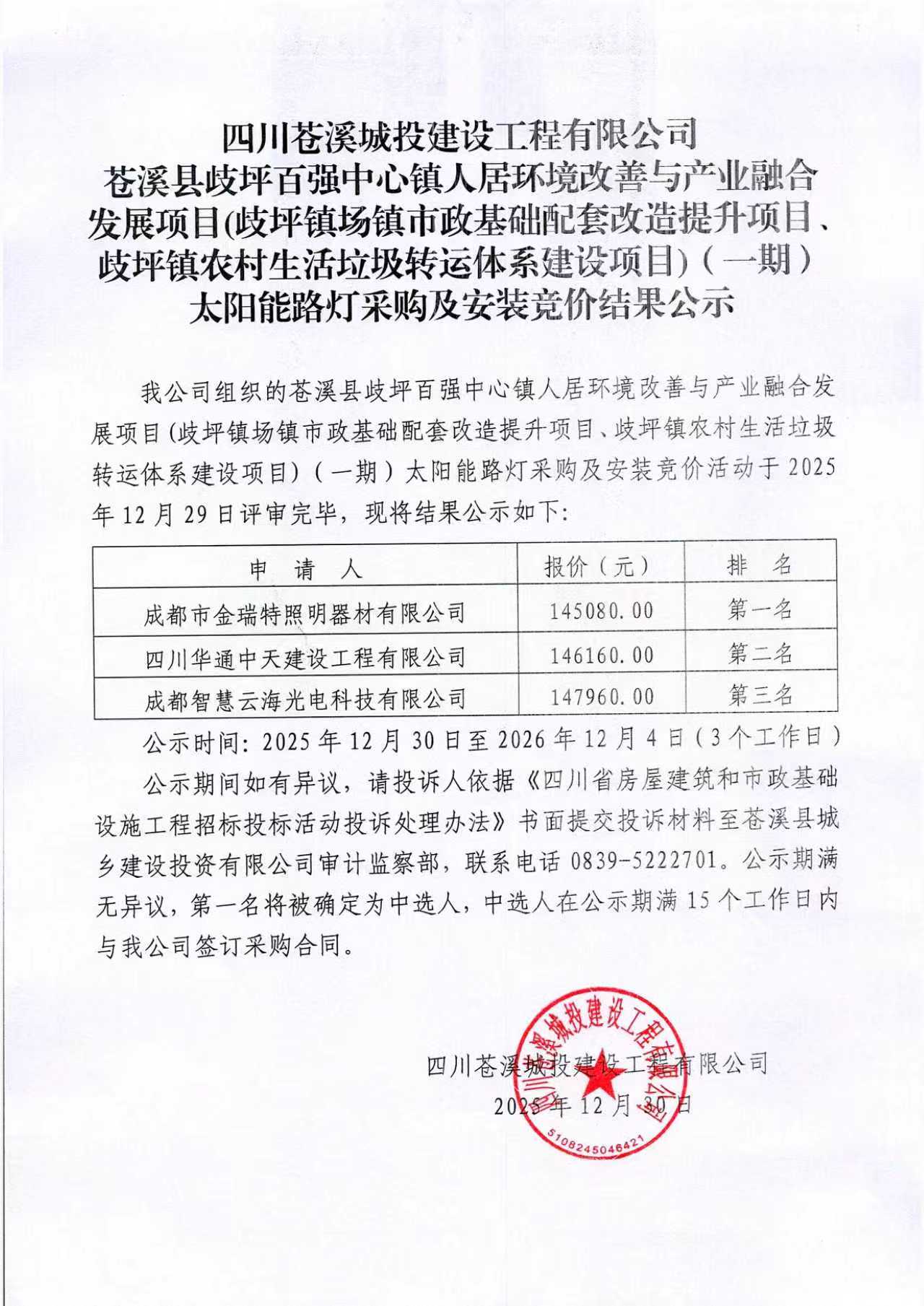 四川苍溪城投建设工程有限公司苍溪县歧坪百强中心镇人居环境改善与产业融合发展项目(歧坪镇场镇市政基础配套改造提升项目、歧坪镇农村生活垃圾转运体系建设项目)(一期)太阳能路灯采购及安装竞价结果公示