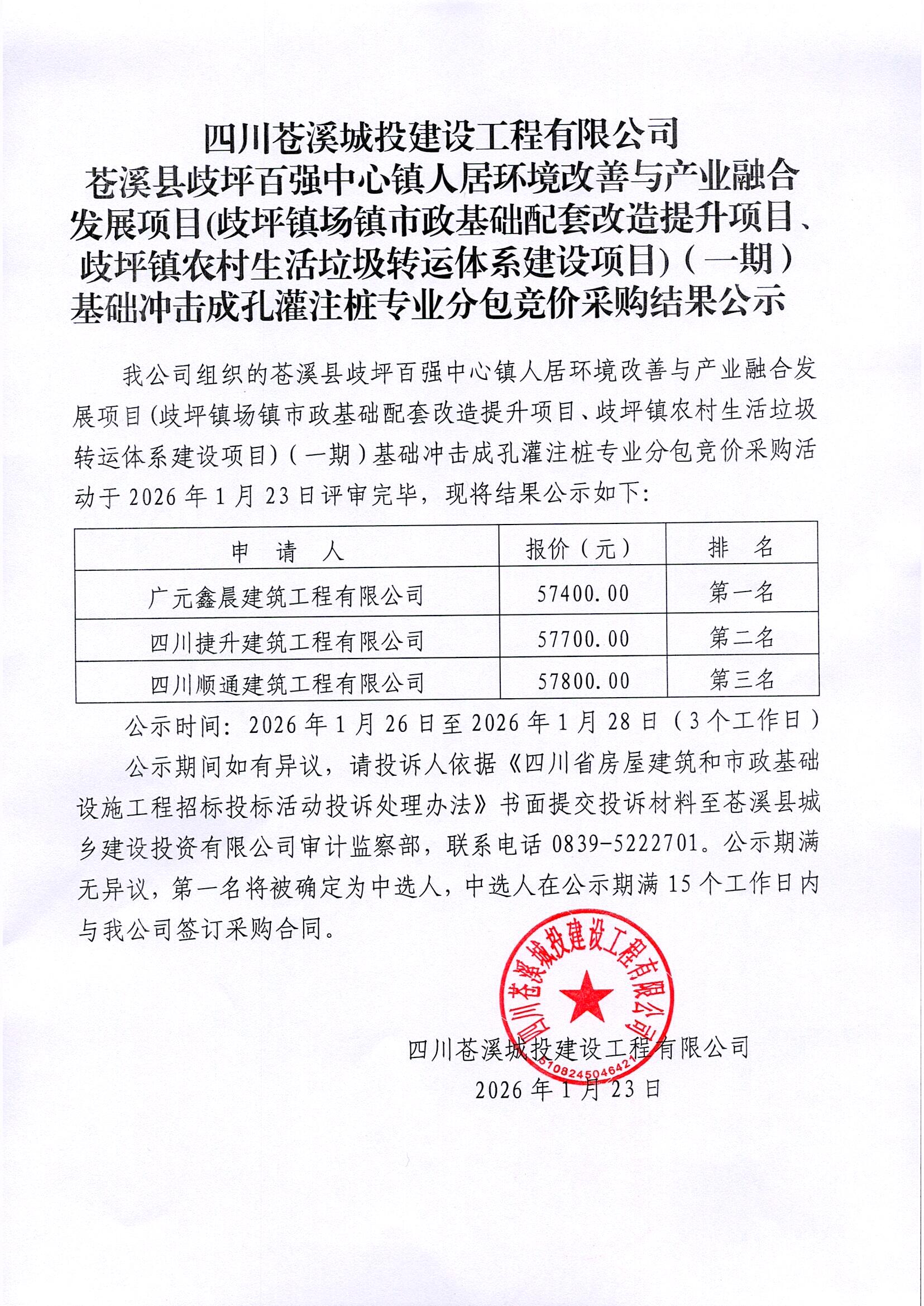 四川苍溪城投建设工程有限公司苍溪县歧坪百强中心镇人居环境改善与产业融合发展项目(歧坪镇场镇市政基础配套改造提升项目、歧坪镇农村生活垃圾转运体系建设项目)(一期)基础冲击成孔灌注桩专业分包竞价采购结果公示